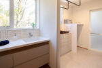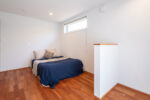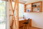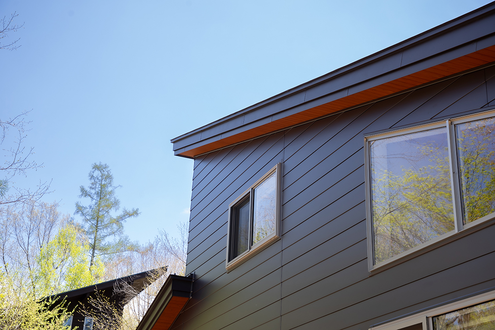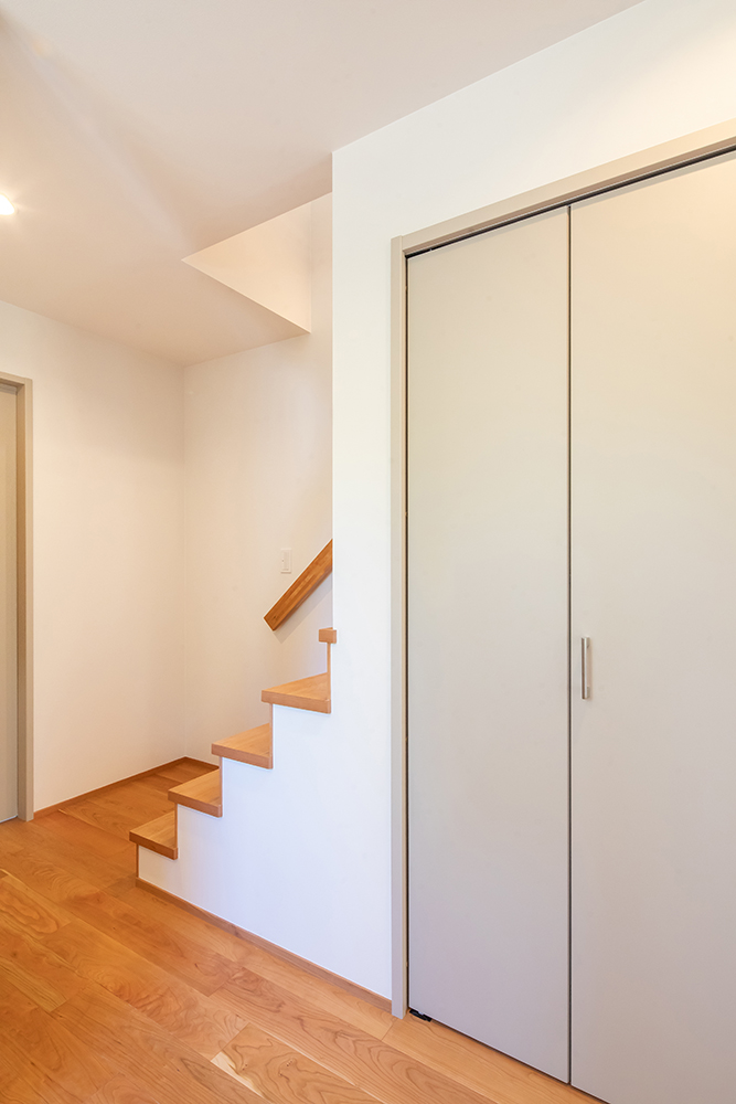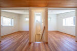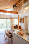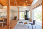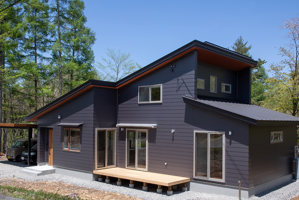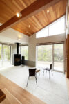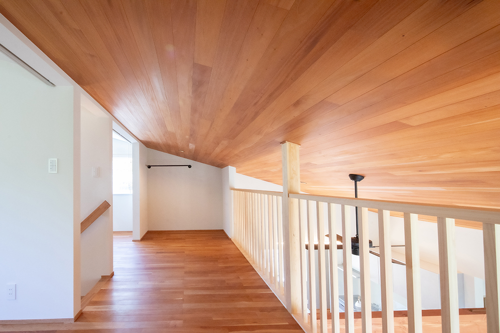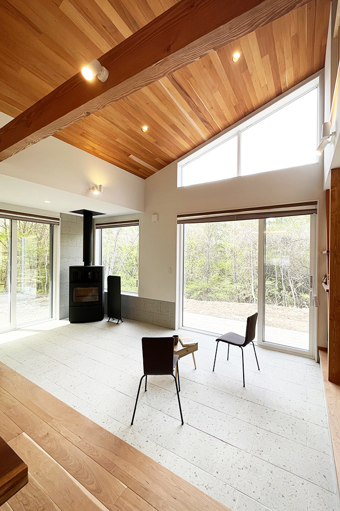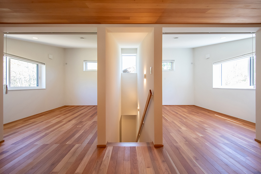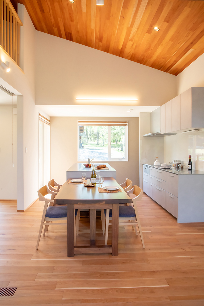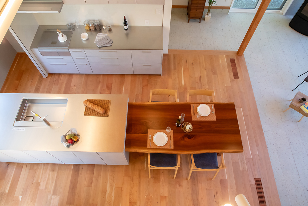 ブラックチェリーの無垢板が鮮やかなLDKは、勾配天井から2階の子供部屋までが一体の大空間。大きな窓からは豊かな緑の景色が広がります。土間リビングの大谷石と薪ストーブも木部と相性が良く、心地よいリビング空間になりました。年月を経て色が深まるブラックチェリーの変化が楽しみなお家です。