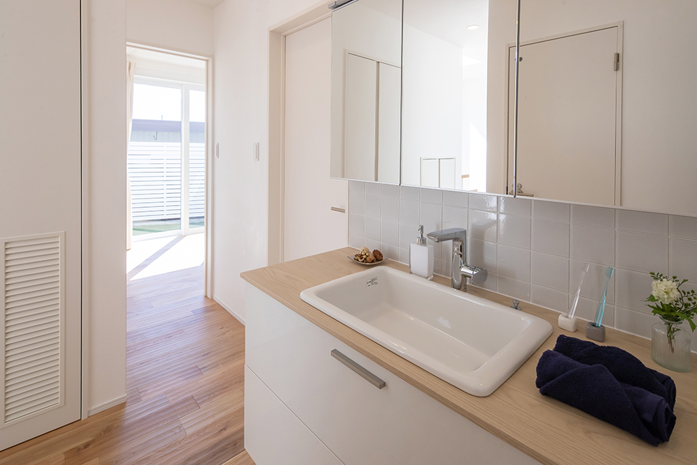 ナチュラル感を残しつつ、白をベースにシンプルに作り上げた家は、周囲の環境を考慮しリビングを2階に配置。