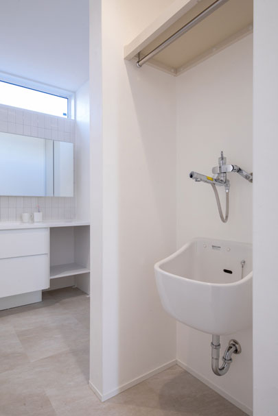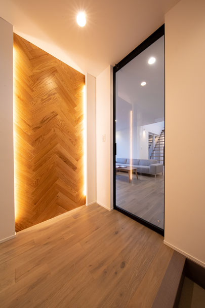 玄関ドア周りとホール正面を板張りでアクセントに、内外装をグレートーンでまとめたモダンな半平屋のお家です。キッチンとカップボードも造作にしてグレートーンの一体感を出しました。リビングドアや洗面化粧台など細部もスッキリしたデザインで統一したデザイン住宅です。